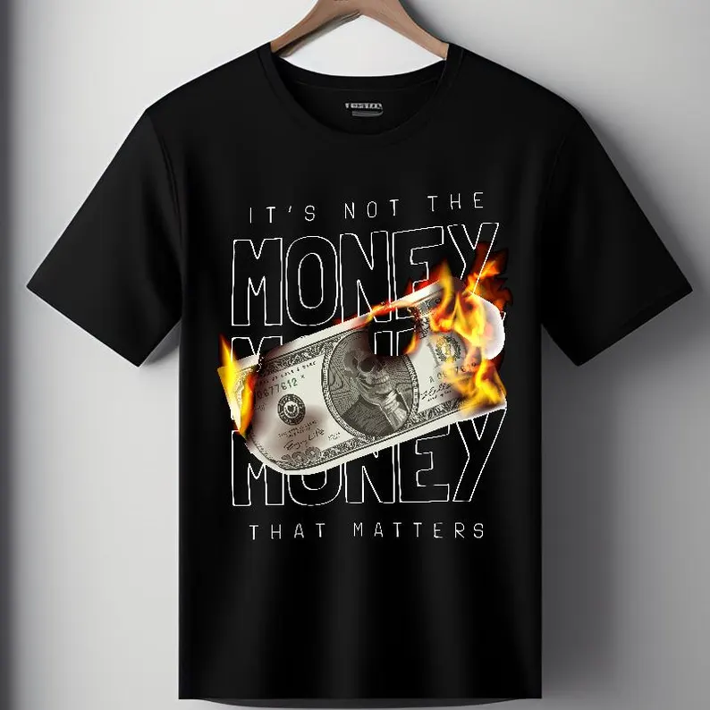 Make a statement with the “It’s Not the Money That Matters” tee. This design features a striking hyper-realistic print of a burning dollar bill with skull detailing, symbolizing a deep perspective on value and life. Perfect for those who want their clothing to start a conversation.